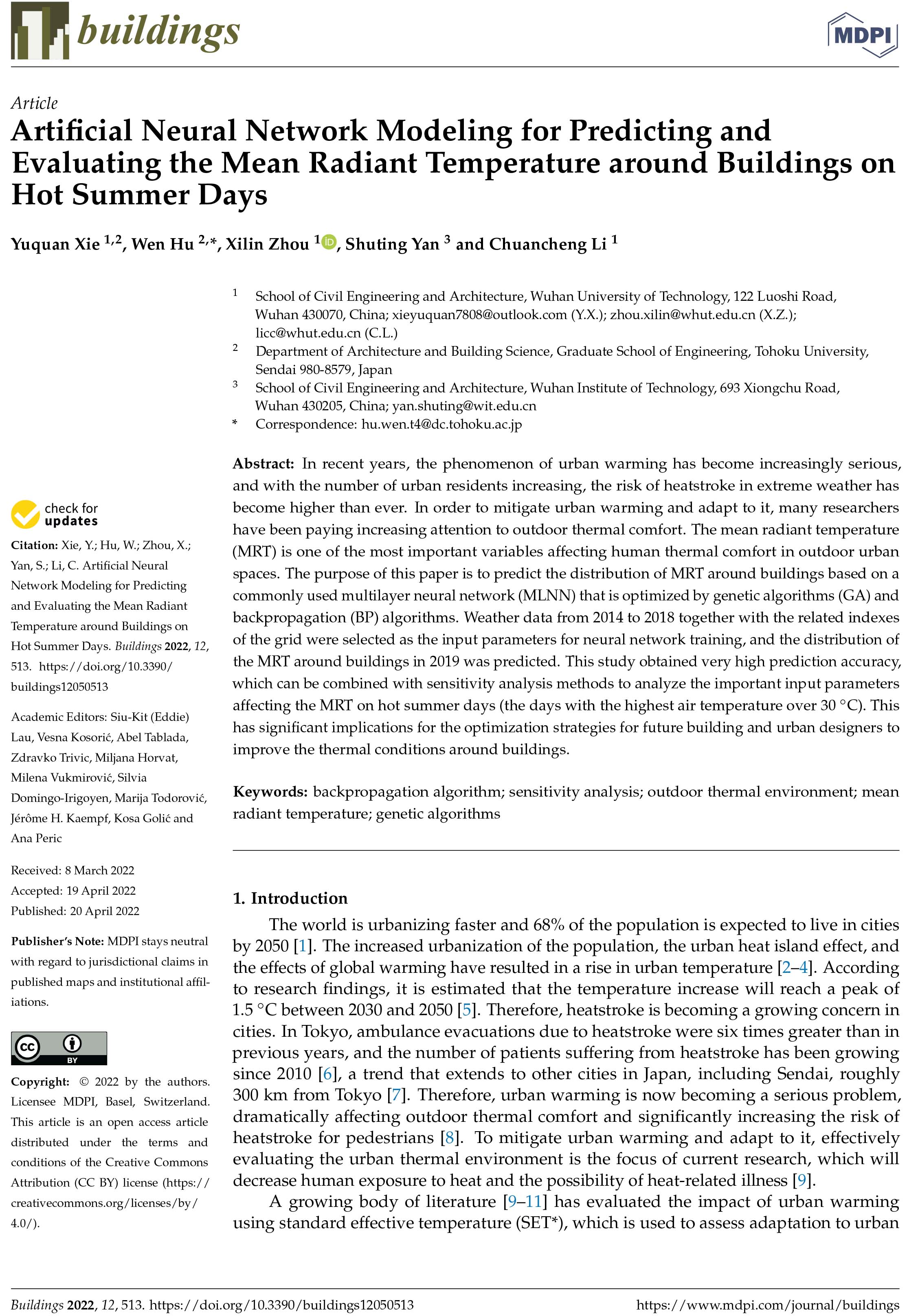 我组谢育全博士以第一作者身份在国际顶刊《Buildings》发表题名为《Artificial Neural Network Modeling for Predicting and Evaluating the Mean Radiant Temperature around Building on Hot Summer Days》的文章。