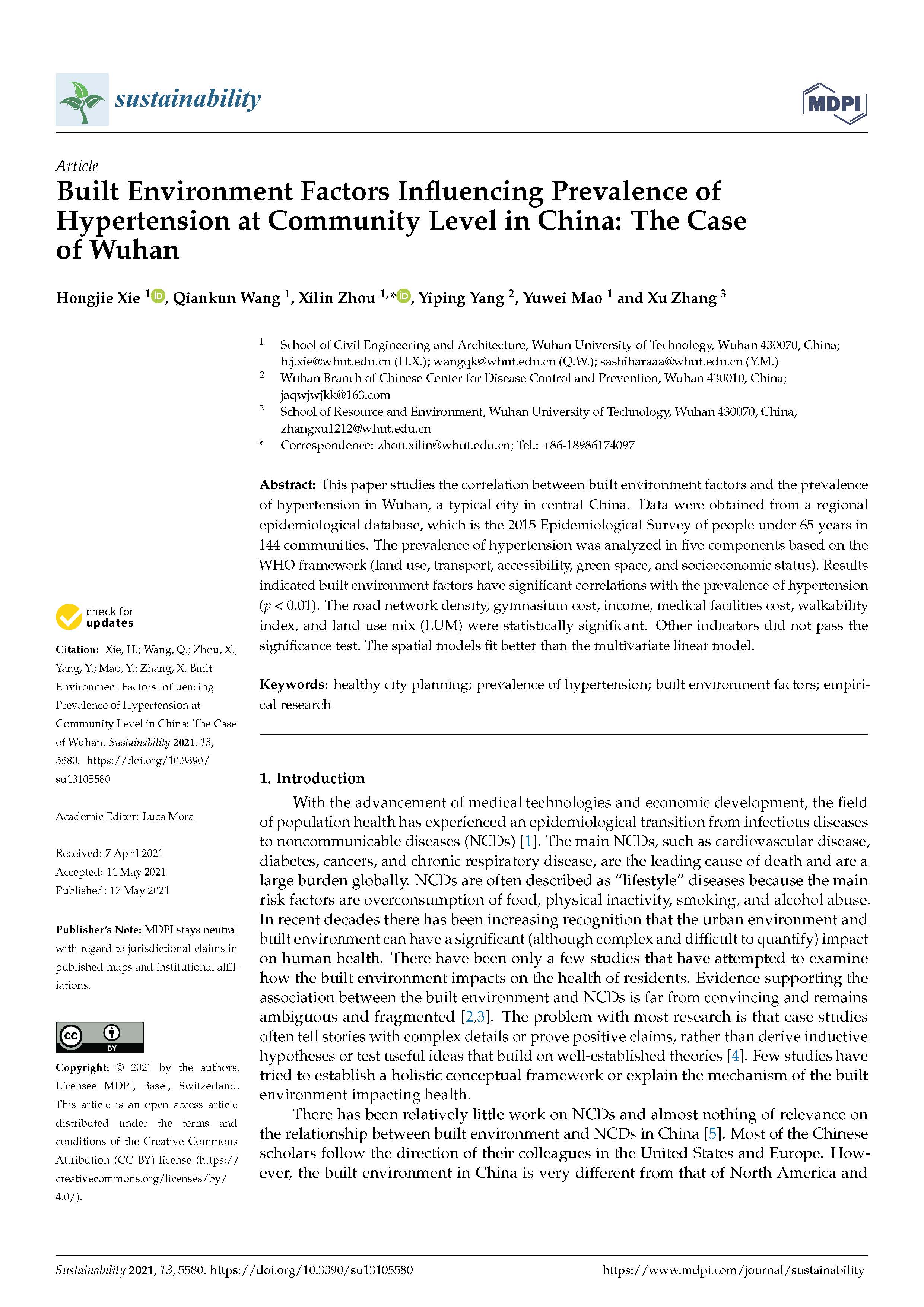 我组谢宏杰副教授以第一作者身份在国际知名期刊《Sustainability》发表题名为《Built Environment Factors Influencing Prevalence of Hypertension at Community Level in China: The Case of Wuhan》的文章。