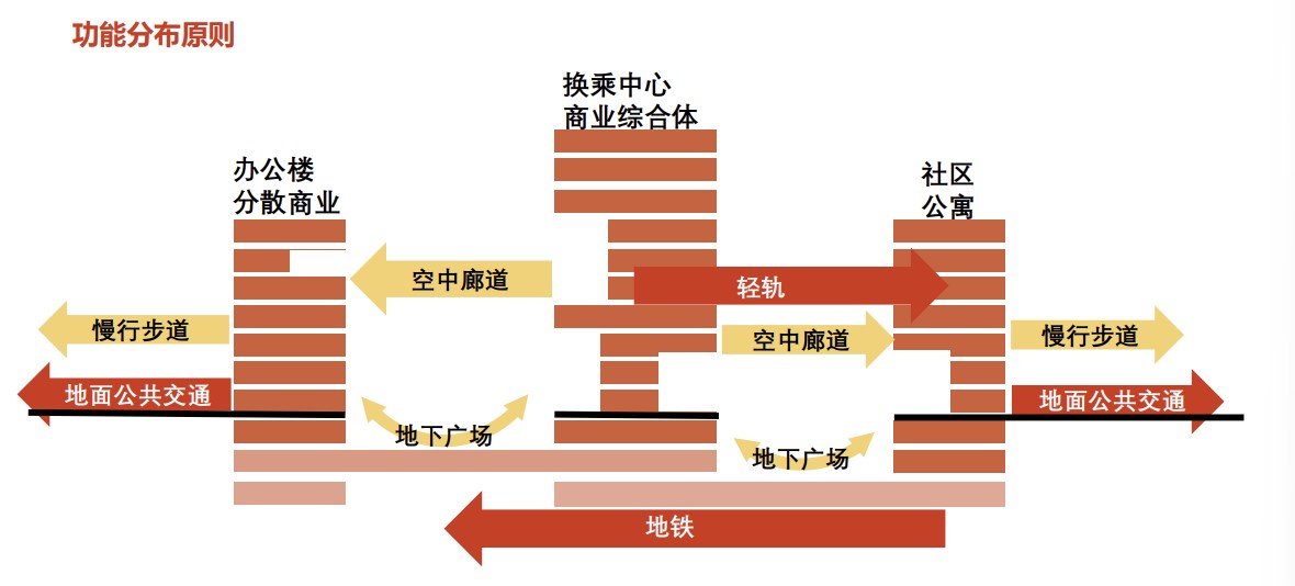 在空间塑造上,以上中下三层联系空间,形成15分钟生活圈,使居民和雇员在不排斥小汽车的同时能方便地选用地铁、公交、自行车、步行等多种出行方式。