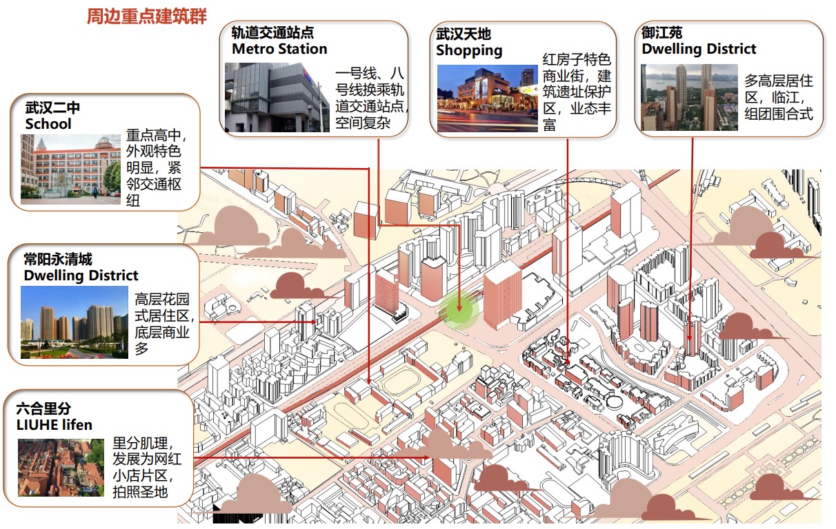 黄浦路站周边业态丰富,包含商业、居住、绿地、公共、教育、武汉老里份。