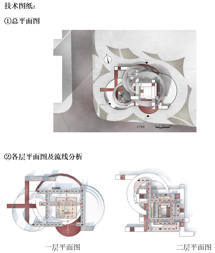 一层四周适应场地,向城市界面敞开,主入口在南侧,可直接进入建筑主体,次入口在西侧,可通过庭院再进入建筑;二层以通道空间为主,形成便于游览参观的环形空间,并在空间的间隙中设置公共空间,供游客们休息与交流;三层的主体也为通道展览空间,但兼有许多室外平台,供游客参观结束后进行休息讨论,且设置了室外楼梯连通行进流线。