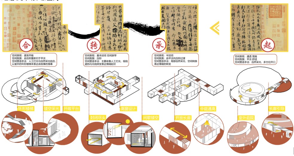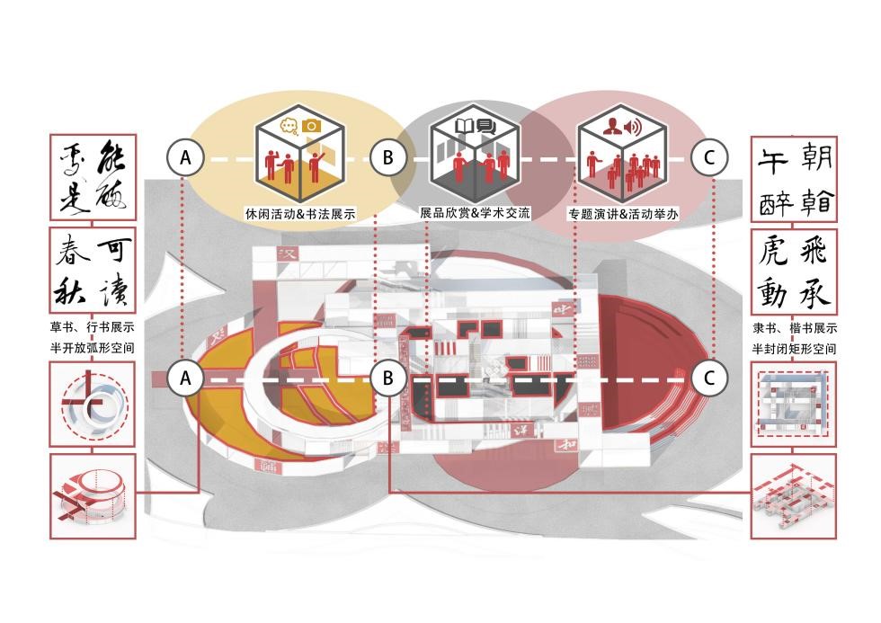 整个展览馆根据空间开敞度、活跃度等特点,基于不同书法的主要风格特点,主要将场地功能分为三个部分:西侧的庭院,中部的主体建筑,东侧的演讲展示台。