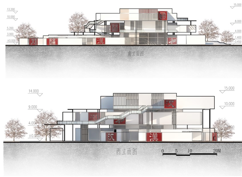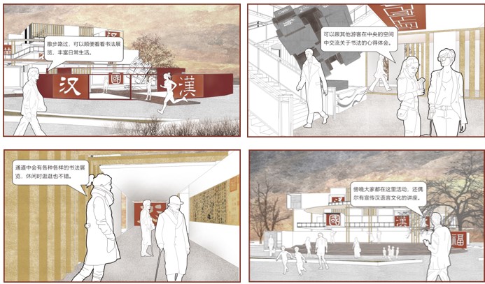 场地西侧半开放弧形庭院空间主要用于休闲漫步,引入人流,并作草书、行书等不规则字体书法展示。中部主体建筑内半封闭矩形空间主要展示隶书、楷书等规则书法字体。场地东侧开放演讲展示平台主要用于宣传汉语言文化的讲座与活动举办。