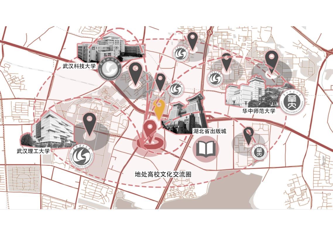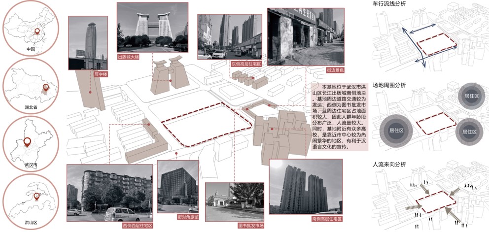 本项目选择基地位于武汉市洪山区长江出版城南侧地块,其处于武昌中心附近,就近有出版城与图书批发市场,资料储备完善。且距离武汉市各大知名高校较近,有较好的文化辐射力,可以依托出版城与高校助力,更好地向整片区域进行普及汉语言文化。