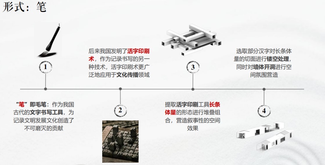 “笔”即毛笔:作为我国古代的文字书写工具,为记录文明发展文化创造了不可磨灭的贡献。后来我国发明了活字印刷术,作为记录书写的另一种技术,活字印刷术更广泛地应用于文化传播领域。设计提取活字印刷工具长条体量的形态进行堆叠组合,营造叙事性的空间效果,同时选取部分汉字对长条体量的切面进行镂空处理,同时对墙体开洞进行空间氛围营造。
