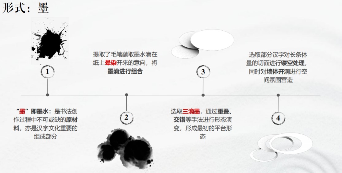 “墨”即墨水:是书法创作过程中不可或缺的原材料,亦是汉字文化重要的组成部分。设计提取了毛笔蘸取墨水滴在纸上晕染开来的意向,将墨滴进行组合。选取三滴墨,通过重叠、交错等手法进行形态演变,形成最初的平台形态。并进一步将平台形态由“圆片”处理为”圆环”营造光影效果,增强平台的轻盈感与通透感。
