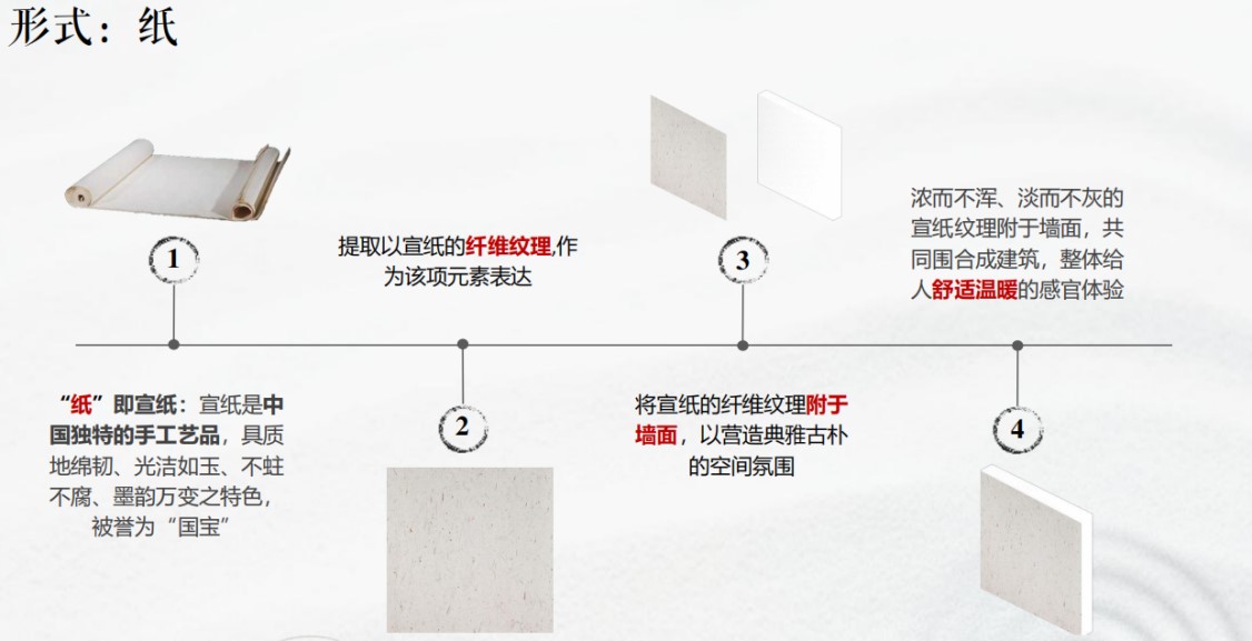 “纸”即宣纸:宣纸是中国独特的手工艺品,具质地绵韧、光洁如玉、不蛀不腐、墨韵万变之特色。设计提取宣纸的纤维纹理,作为该项元素表达,将浓而不浑、淡而不灰的宣纸纹理附于墙面,共同围合成建筑,整体给人舒适温暖的感官体验。
