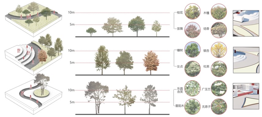 景观节点可总结为通过式、包围式、观赏式:通过考察结合武汉当地气候条件及树种高度,提出符合场所氛围(三种节点中高度依次递增)的植被品种选择。
