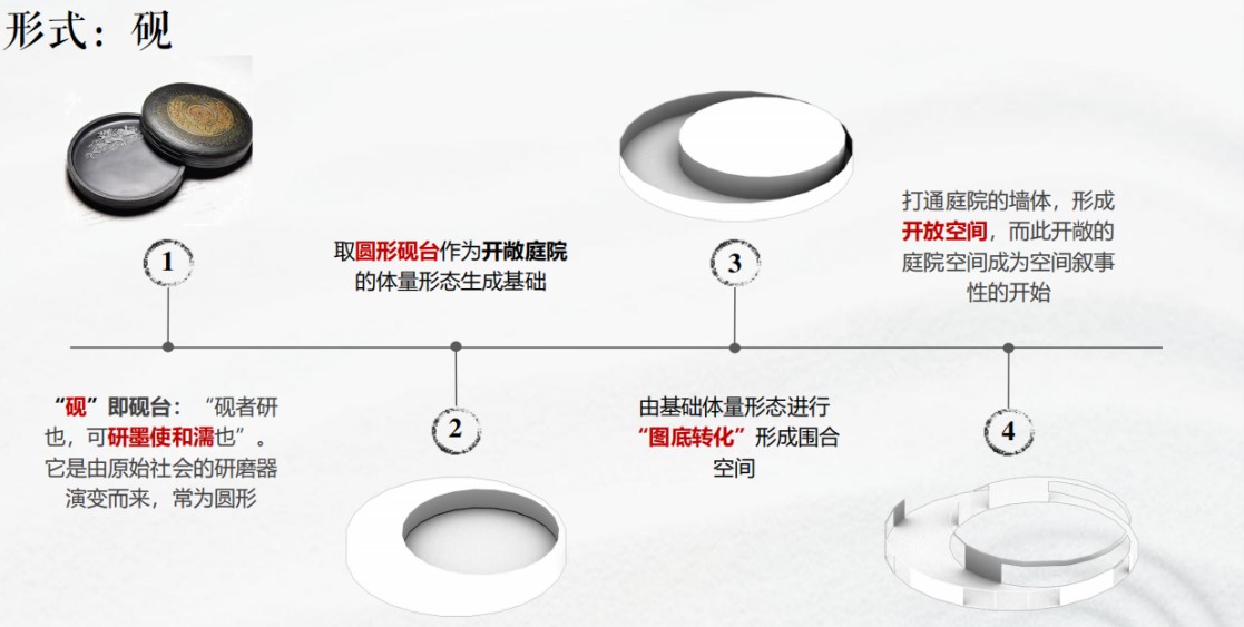 “砚”即砚台:“砚者研也,可研墨使和濡也”,是由原始社会的研磨器演变而来,常为圆形。取圆形砚台作为开敞庭院的体量形态生成基础,进一步通过“图底转化”形成围合空间,同时打通庭院墙体,形成开放空间,而此开敞的庭院空间也成为空间叙事性的开始。