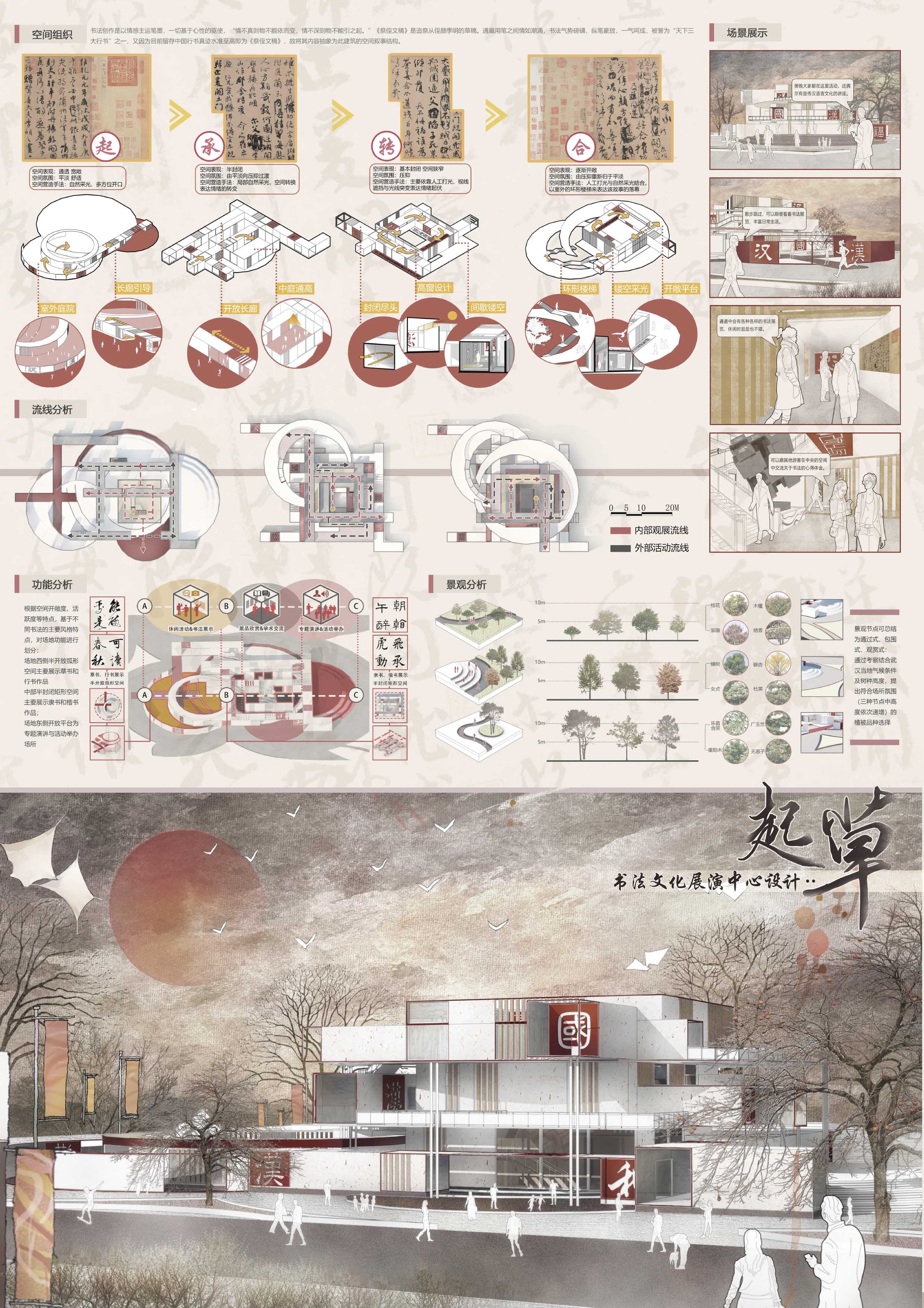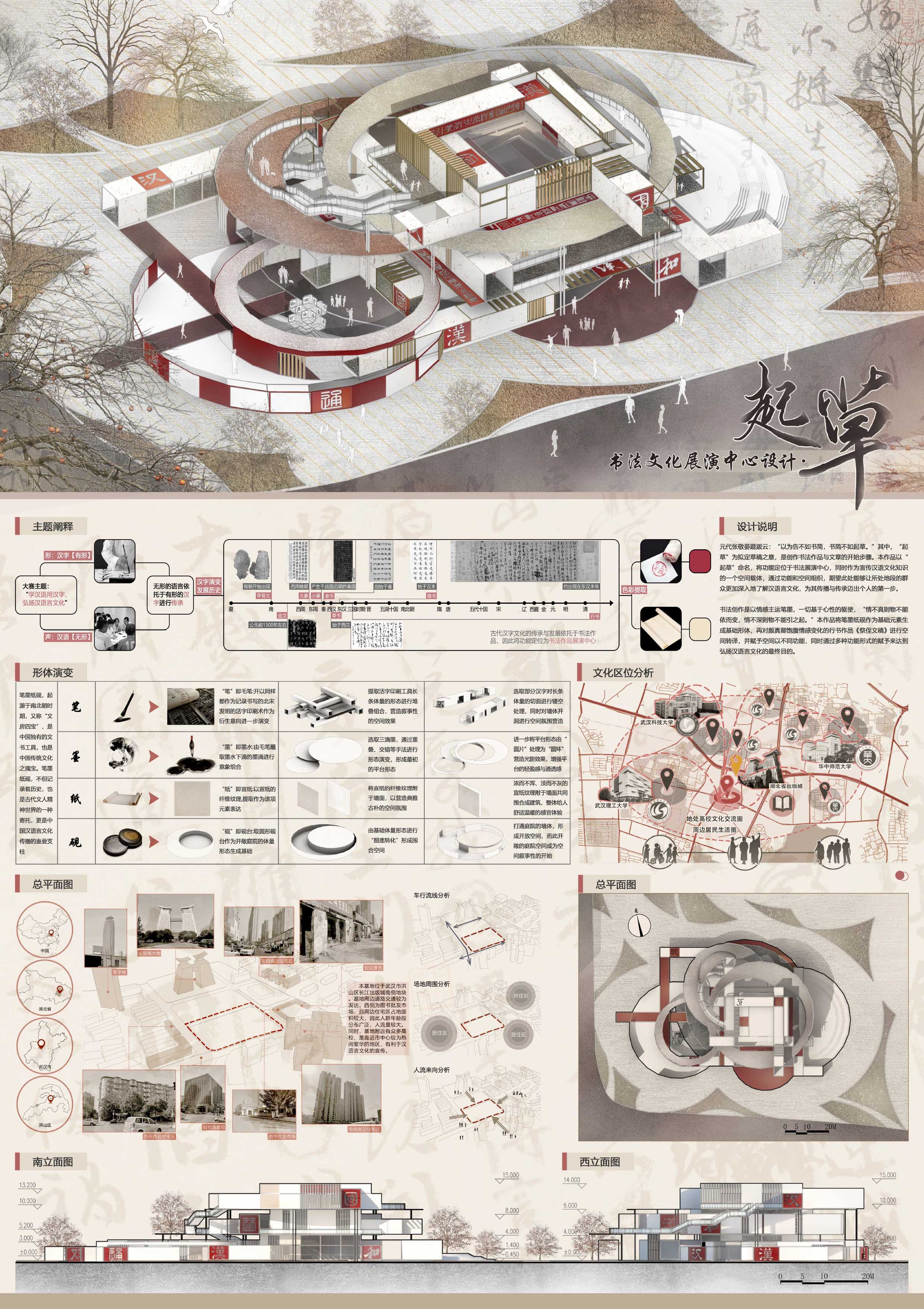 其中,“起草”为拟定草稿之意,是创作书法作品与文章的开始步骤。本作品“起草”命名,将功能定位于书法展演中心,同时作为宣传汉语文化知识的一个空间载体,通过功能和空间组织,期望此处能够让所处地段的群众更加深入地了解汉语言文化,为其传播与传承迈出个人的第一步。